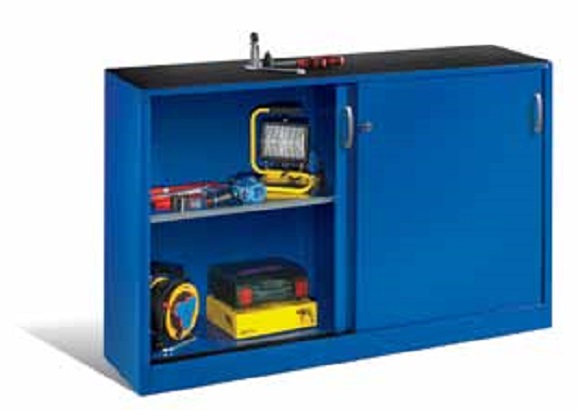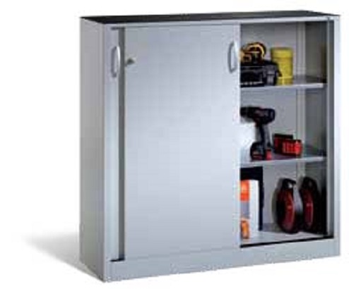 L'armoire de comptoir à portes coulissantes vous fait gagner la plage de pivotement des portes battantes. Avec les armoires à portes coulissantes vous gagnez de la place et augmentez la sécurité.