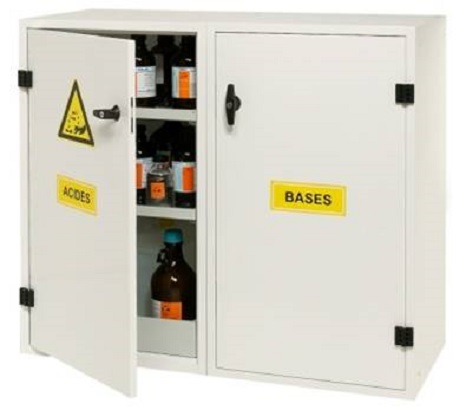 - Etagères de rétention réglables en hauteur au pas de 25mm avec doublages en PEHD anticorrosion pour le compartiment Acides