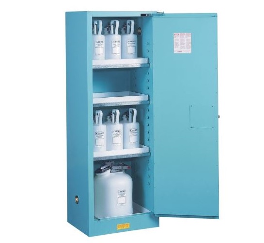 Fabriquée en acier, cette armoire de sécurité est recouverte d’une peinture formulée exclusivement et comprend des plateaux polyéthylène qui résistent aux acides, aux bases et aux solvants.