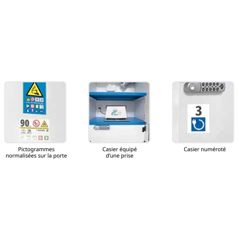 Cette armoire de stockage de batterie lithium s'utilise pour la mise en sécurité et la recharge des équipements électriques de vos employés, de vos usagers, clients et visiteurs.
