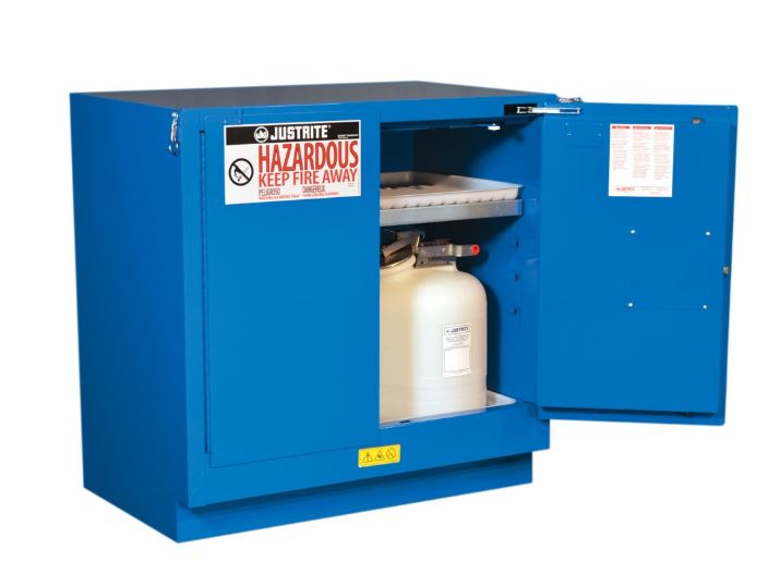 Cette armoire sous paillasse pour produits chimiques s’encastre sous votre établi ou votre plan de travail pour entreposer des produits dangereux en toute sécurité.