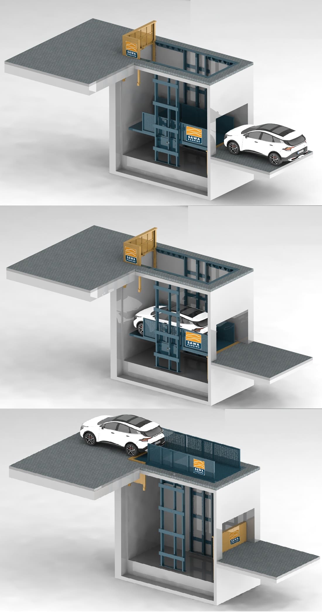 Ce système de car-lift est personnalisable en fonction de la hauteur de levage (plusieurs niveaux possible) et de la capacité.