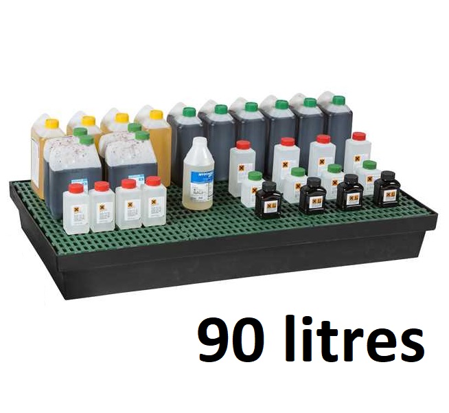 Dans sa version avec caillebotis, ce bac de rétention pour labo et plan de travail permet de stocker jusqu'à 90 litres de liquides dangereux conditionnés.