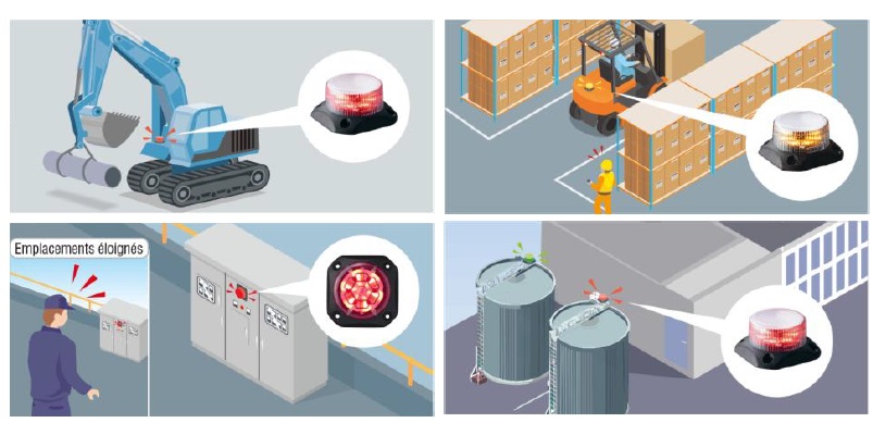 Ces balises d'avertissement s'utilisent également sur les véhicules industriels de chantier ou de manutention, ainsi que sur les installations fixes.