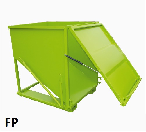 Le conteneur à déchets FP est une benne à fond Incliné à 120°, équipée d'une porte frontale. Cet équipement n'utilise pas de dispositif de basculement pour procéder au vidage total de la benne. Le fond en pente permet une évacuation des déchets sans rétention.
