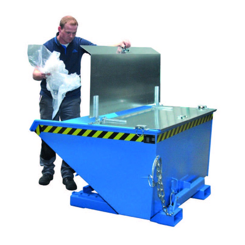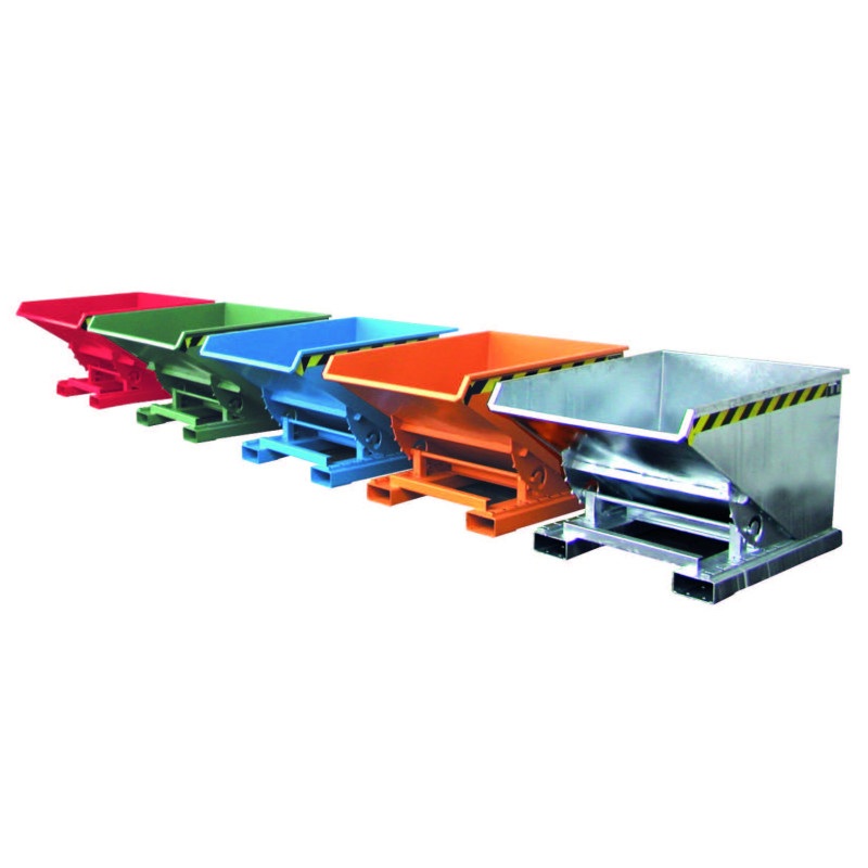 Cette benne basculante à mécanisme dérouleur est un outil de manutention de déchets compact et robuste, d'une capacité de 750 kg.