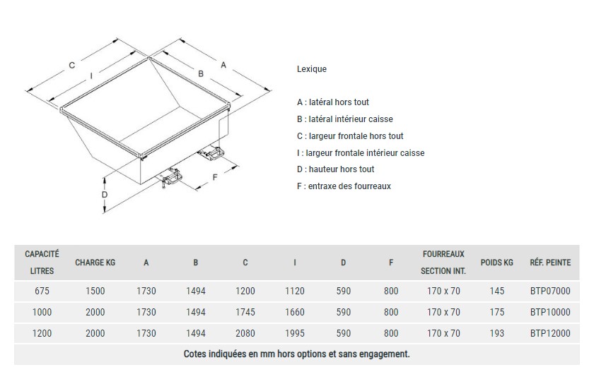 | RÉFÉRENCE BENNE POUR CHARIOT TÉLÉSCOPIQUE | BTP07000 | BTP10000 | BTP12000 |