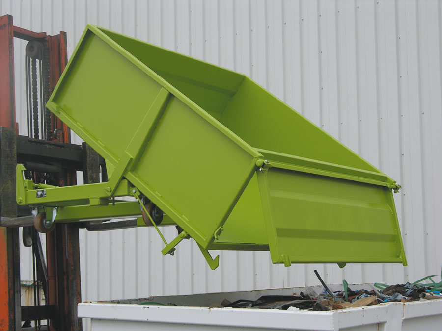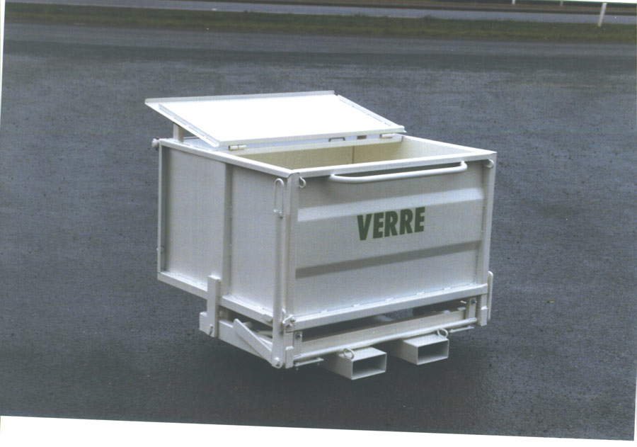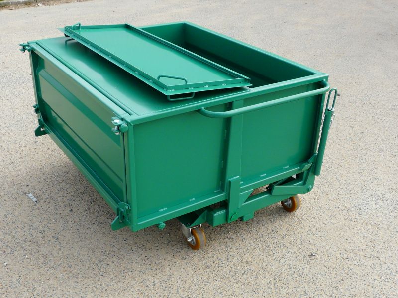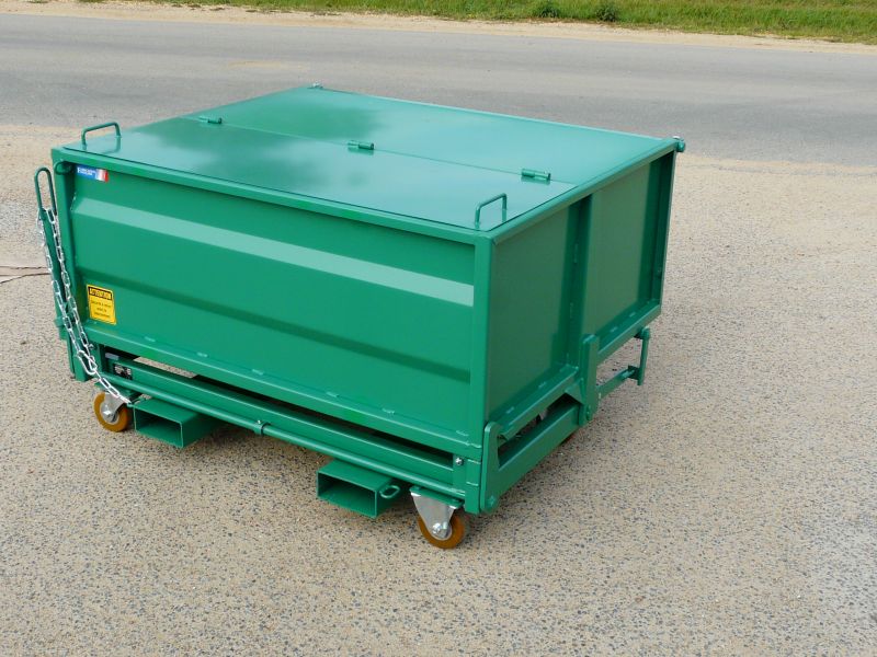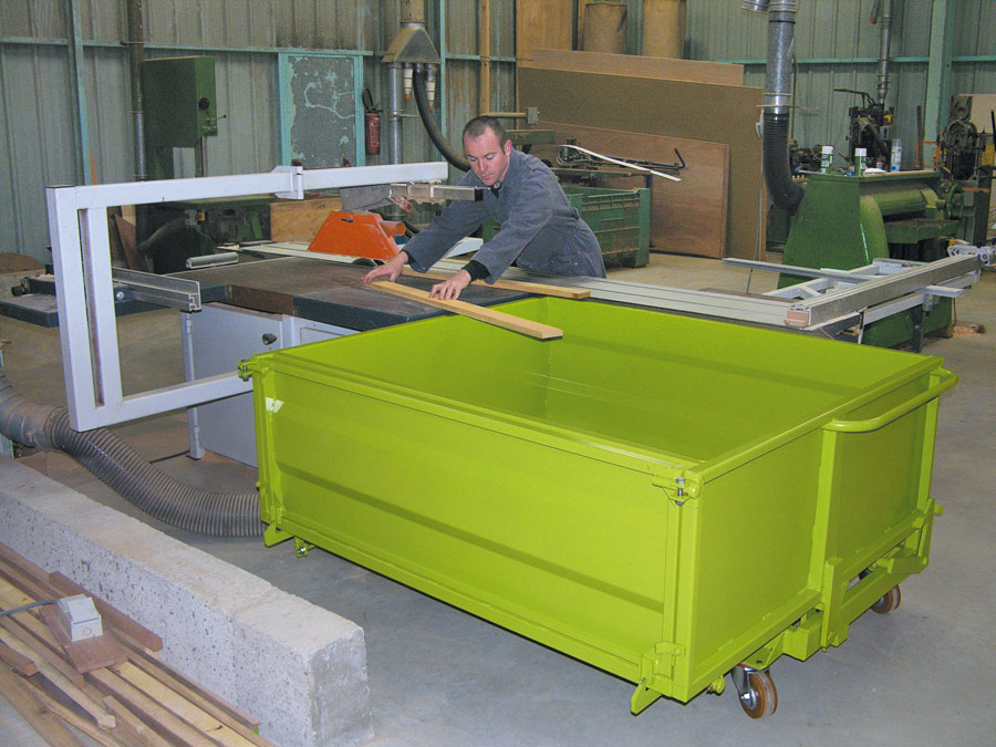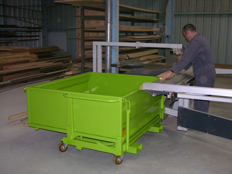 La benne surbaissée BS est une benne basculante surbaissée à porte frontale BS. Conçue pour être à hauteur table de travail, elle permet de collecter les chutes de bois, le verre, la sciure ou les poussières.