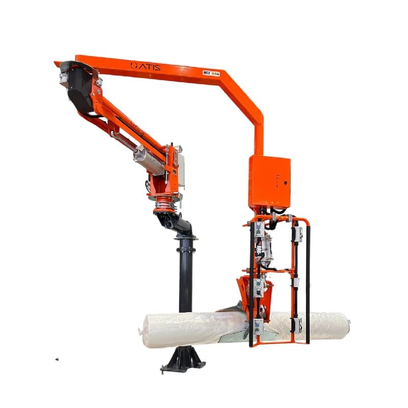 Ce bras manipulateur équilibré à pince est spécialement pour la manutention et le positionnement de rouleaux textiles sur une palette industrielle ou une machine.