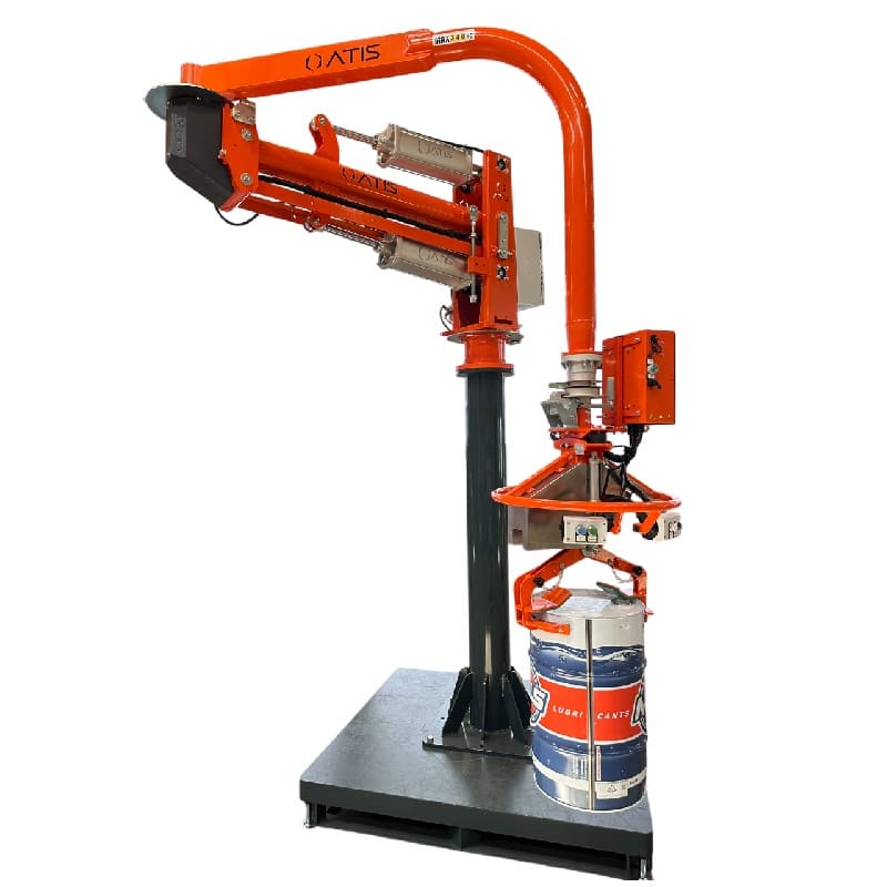 La configuration personnalisée du manipulateur ATISmirus 300 avec système de préhension pneumatique a été spécialement conçue pour répondre aux besoins de manutention des fûts. La flexibilité de la préhension, combinée à la capacité du manipulateur, permet une gestion sûre et efficace du processus.