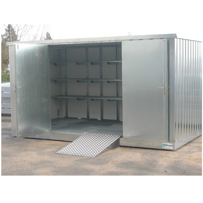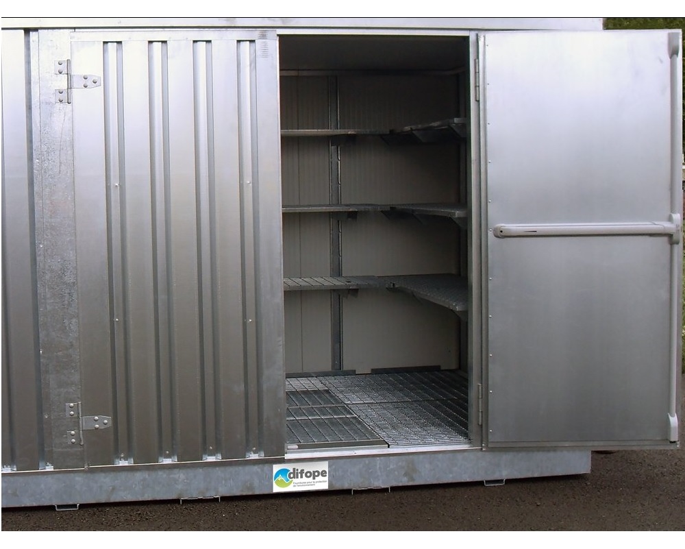 Ce module de stockage est muni d'un bac de rétention (de 350 à 1454 L) avec un plancher en caillebotis amovible et 2 portes battantes verrouillables.