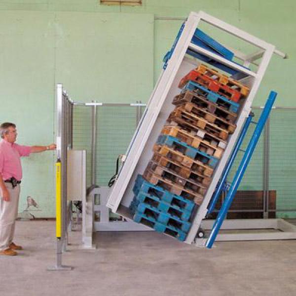 Principe de fonctionnement des trieurs de palettes automatiques : les palettes sont chargées comme dans un magasin. Le basculement à 90° permet à l'opérateur d'accéder aux palettes défectueuses et de les sortir. La pile peut éventuellement être complétée après éviction des éléments non conformes.
