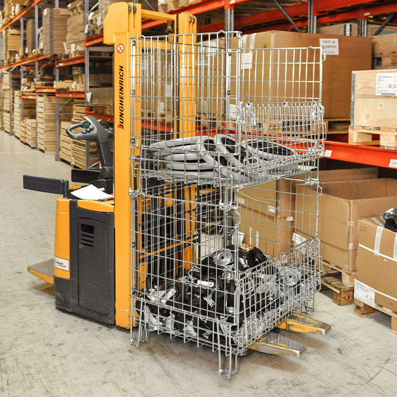 La caisse palette KM079119 est un conteneur grillagé normalisé, pliable et empilable, à maille métallique.