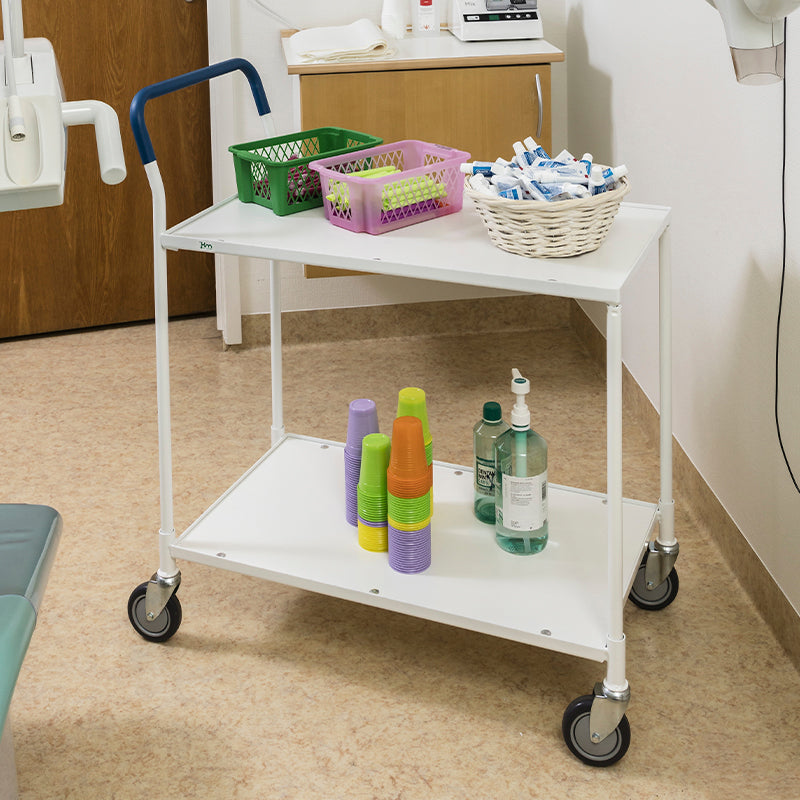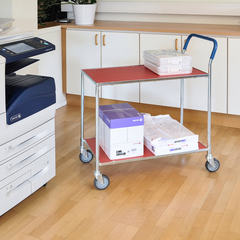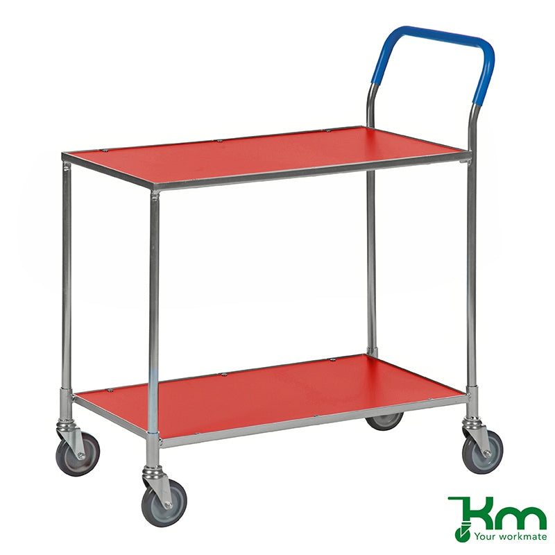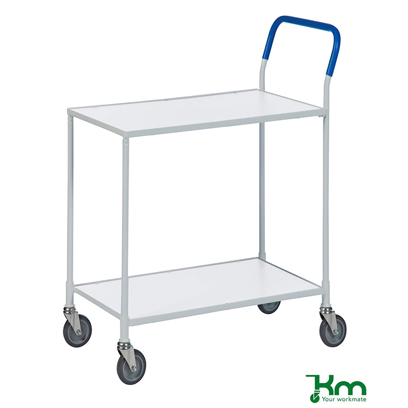 Le chariot de service à roulettes KM3730-BJ est un modèle 2 étagères à poignée verticale recouverte pour une meilleure préhension et un confort d'utilisation optimisé.