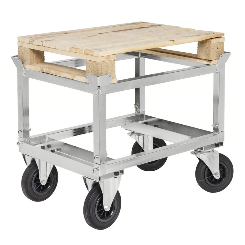 Disponible en plusieurs versions basse / réhaussée / réglable, ce chariot roule palette à coins permet une adaptation précise aux dimensions EURO 1200x800 ou 800x600 mm (demi palettes).
