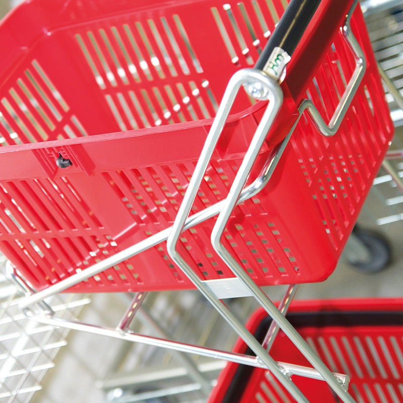 Le chariot porte-panier de courses "libre service" KM111013 est un modèle en fil d'acier électro-galvanisé à deux paniers qui optimise les déplacements pour les courses ou le picking.