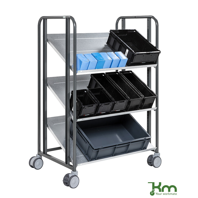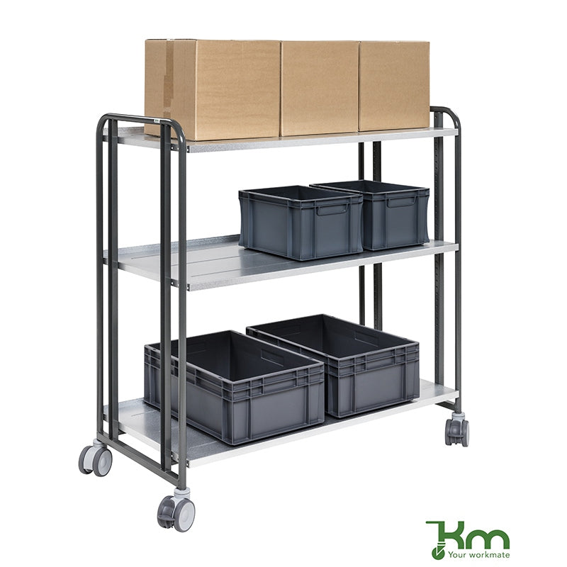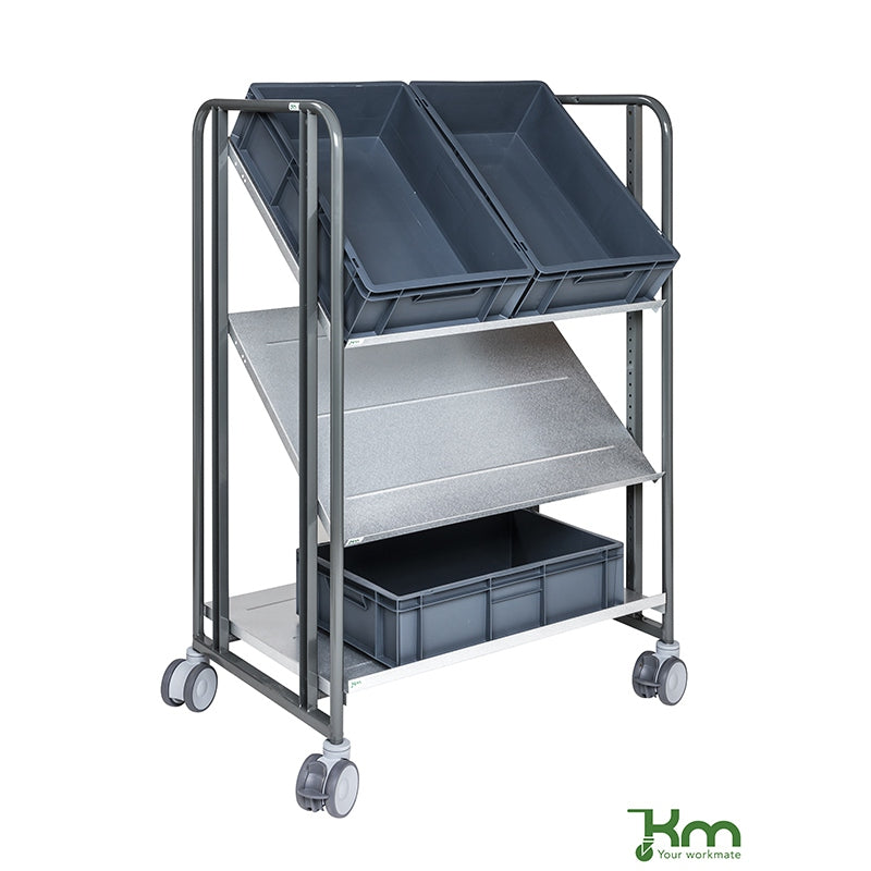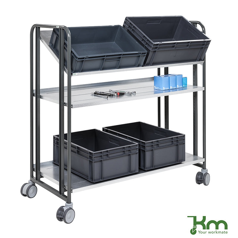 Le chariot de préparateur de commandes KM168-3LL-ERGO est un équipement ergonomique à 3 étagères réglables pour l'industrie et la logistique.