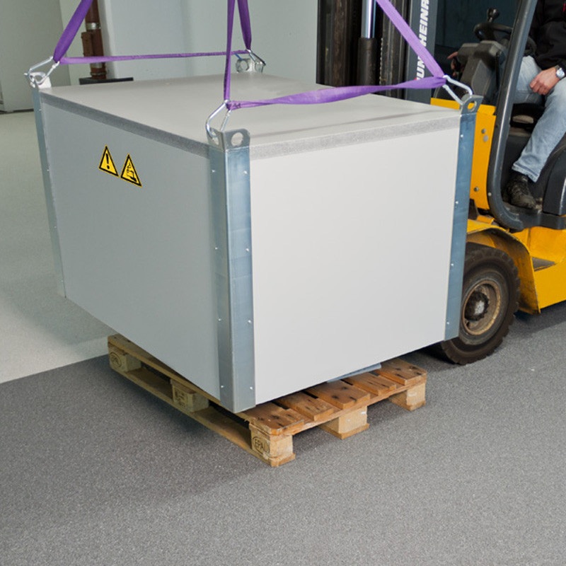 Le coffre est doté d'équerres d'angle stables. Les œillets de levage permettent un transport et une mise en place aisée par le biais de sangle ou de câbles (non fournis).