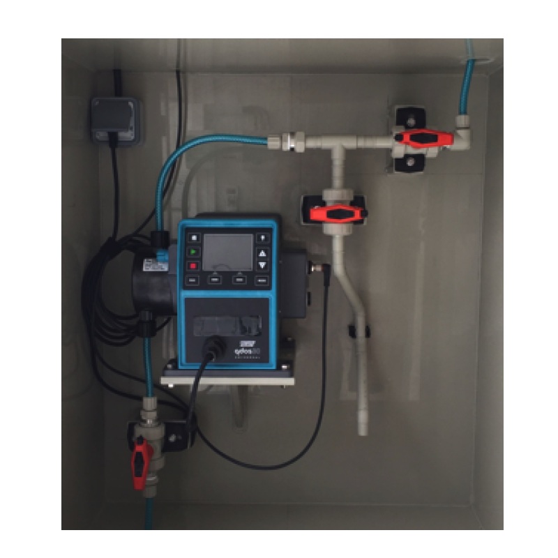 Equipé d'une pompe QDOS, cette armoire de dosage est reliée à l'installation et injecte les réactifs directement dans le circuit d'eau, sans les diluer.