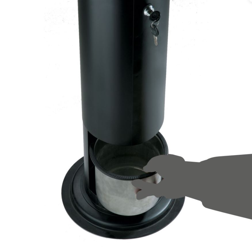 Ce cendrier d'extérieur permet d'écraser sa cigarette et de jeter le mégot sans risque pour l'environnement. Conçu avec un réservoir verrouillé par serrure à clef, il est équipé d'un système de vidage astucieux par le bas.