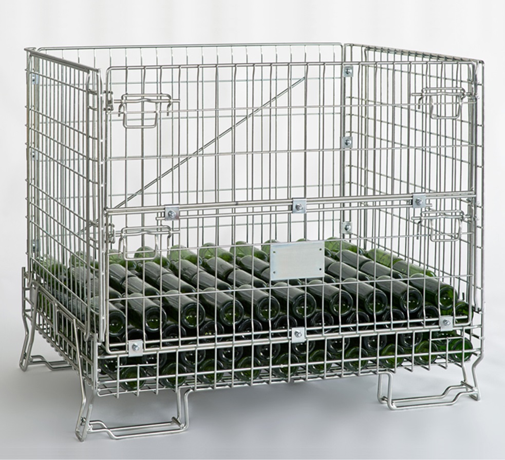 D'une capacité de 600 unités, rangées en 15 lits de 40 bouteilles, cette caisse grillagée est construite avec un socle et des panneaux renforcés.