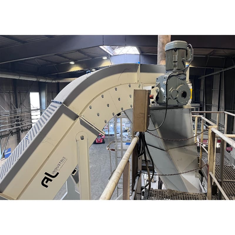 Ces transporteurs mécanisés sont équipés d’un tapis en tôle larmée au pas de 100 mm, une solution parfaitement adaptée au transfert de déchets et copeaux secs ou huileux, supportant une température ambiante pouvant atteindre 350°C. Le système assure un débit de 16 m³/h.