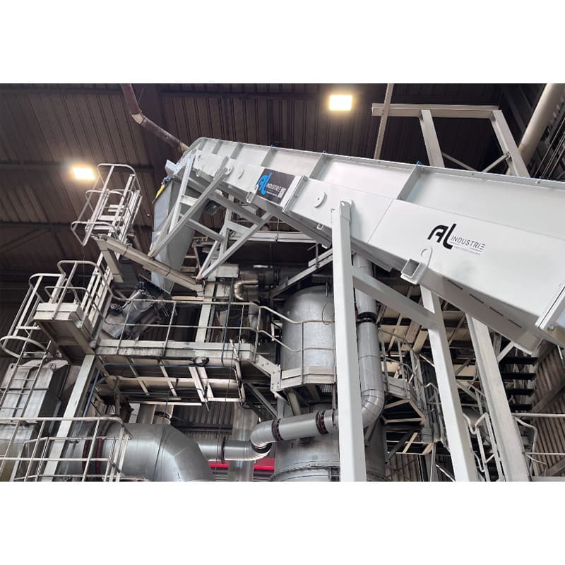 Les convoyeurs sont installés en aval d’une trémie vibrante et d’un séparateur magnétique. Les copeaux d’aluminium sont d’abord réceptionnés puis transférés vers un sécheur. Une fois la matière séchée, elle est reprise par le second convoyeur et acheminée vers le four, où elle est fondue pour être transformée en lingots d’aluminium.