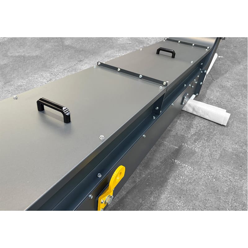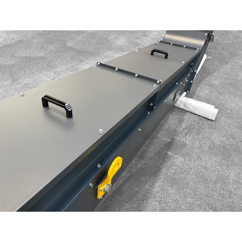 Pour coller au fonctionnement de la chaîne de production, nous avons développé un convoyeur modulaire, équipé d’un tapis métallique électrozingué au pas de 63 mm avec une largeur utile de 400 mm.