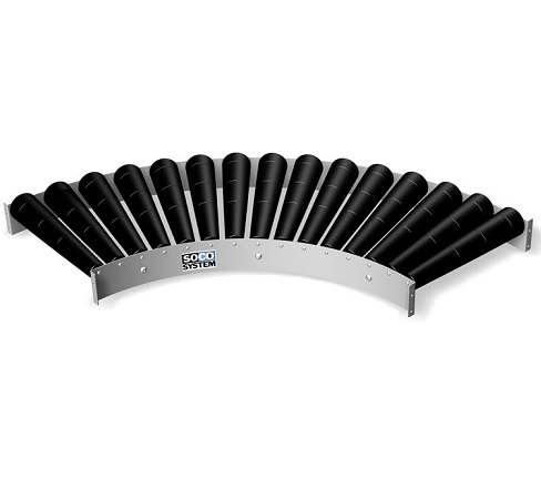 Ce convoyeur courbe est équipé de rouleaux coniques qui facilitent la prise de courbe par les charges manutentionnées.