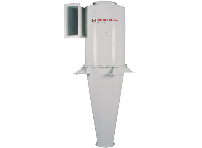 Le cyclone KMde Kongskilde est conçu pour séparer les poussières et les particules, de l'air qui les véhicule. L'air est introduit dans le cyclone, et sa rotation permet à la matière de descendre.