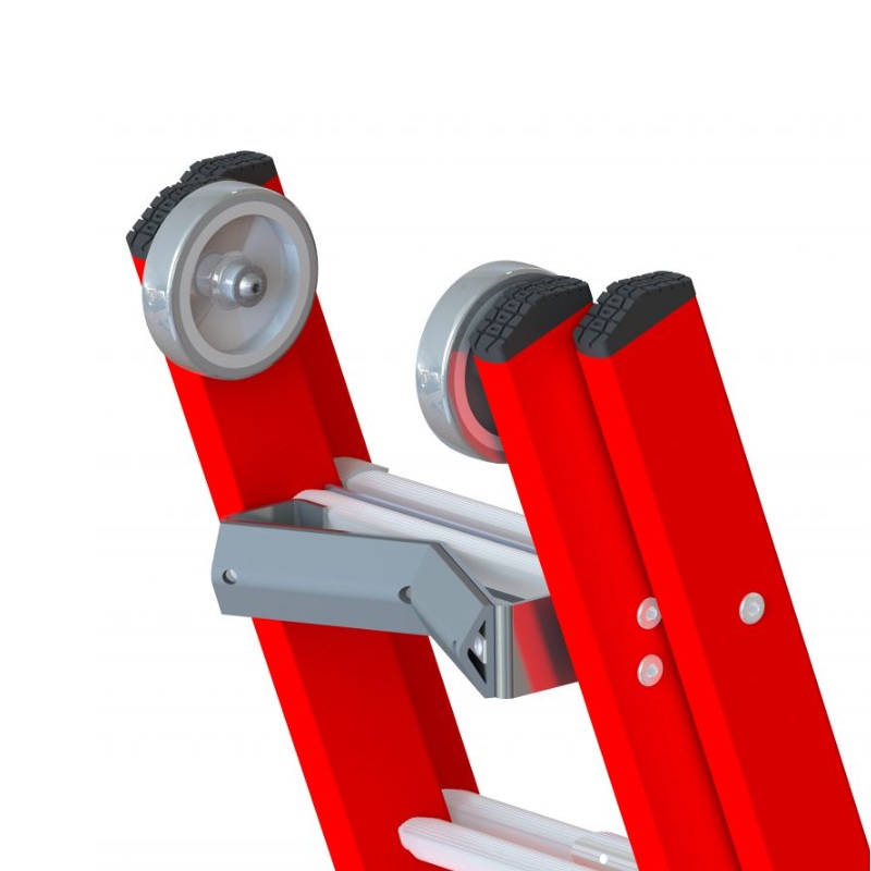 - Roues de façade facilitant le déploiement de l’échelle et protègent le plan en fibre de verre (posées de série sur toute la gamme Hélios)