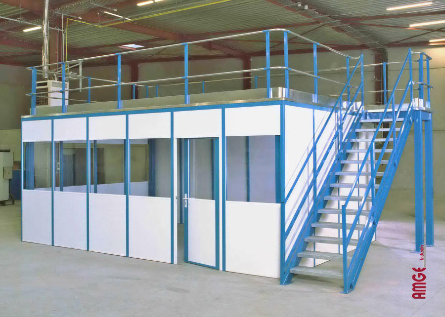 Les cloisons modulaires AMGE industrie peuvent être installées sur et sous plateforme afin d'optimiser l'implantation de vos bureaux d'atelier.