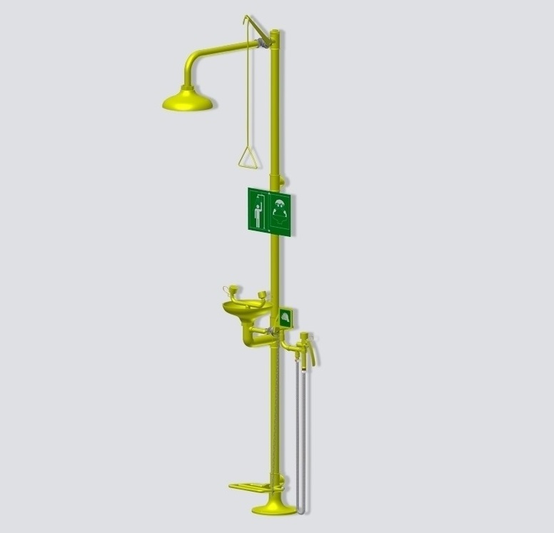 Ce combiné sur pied est très peu encombrant et facile d’installation puisqu’une seule arrivée d’eau est suffisante aux 2 équipements. Il peut être installé en intérieur ou en extérieur en conditions tempérées. L’activation de la douche, du lave-yeux et de la douchette sont indépendantes.