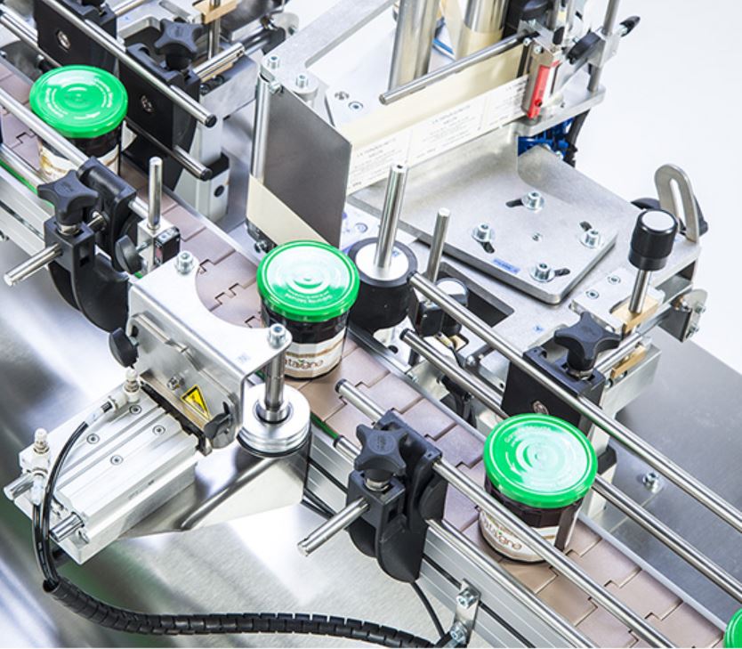 Cette machine d’étiquetage adhésif s’adapte aux différents formats de manière simple et efficace, sans nécessité de changement de matériel. Elle s’intègre facilement à une ligne complète de conditionnement.