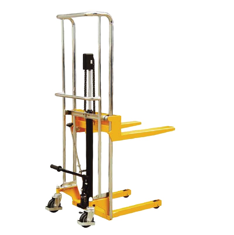 Ce gerbeur manuel est un appareil à levée au pied par pédale conçu sur la base d'un châssis chromé.