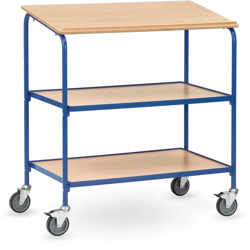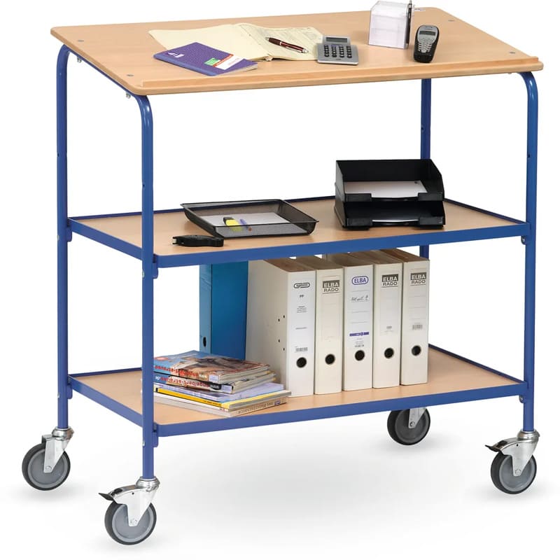 Equipé de 2 niveaux de pose, le pupitre roulant tolère jusqu'à 100 Kg. Dimensions utiles 1000 x 600 mm, avec écritoire et 2 plateaux.
