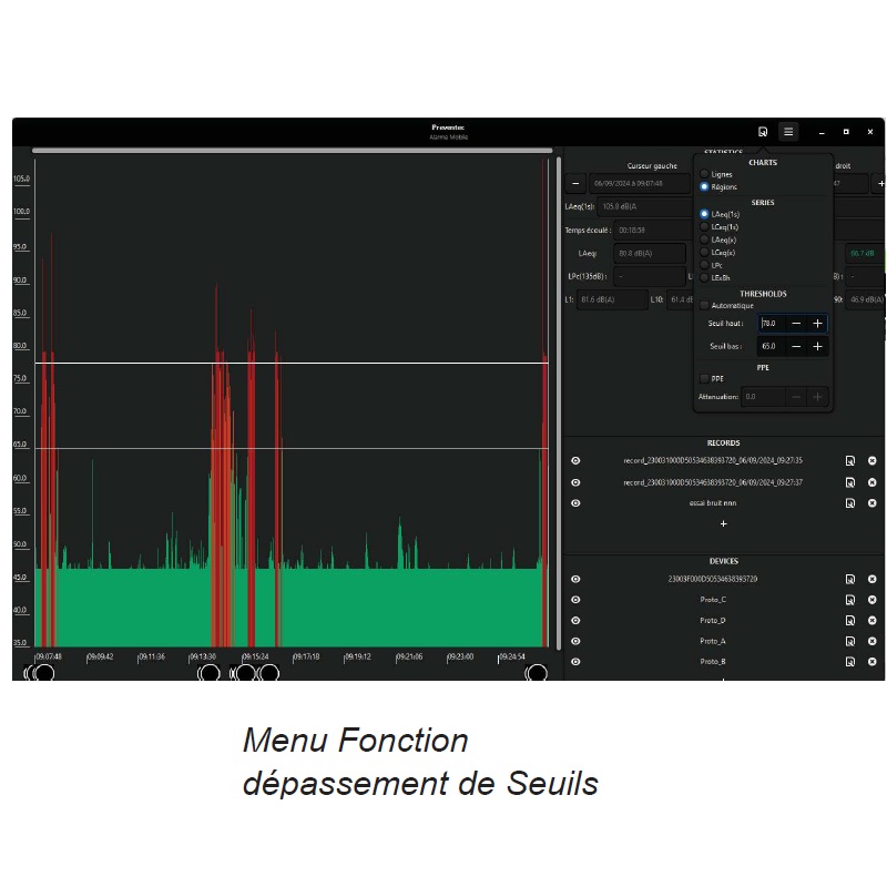 - Enregistrement d'un historique récupérable sur PC ( permet de quantifier, de visualiser l'évolution temporelle du niveau de bruit d'exposition )