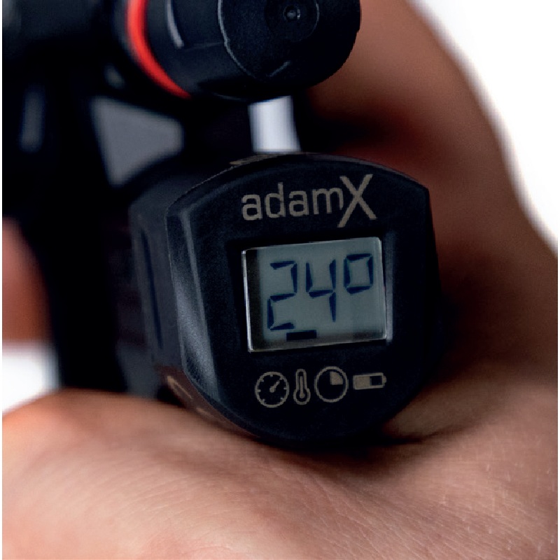 - Pression dynamique d'entrée : Numérique et précis. L’adam X affiche la pression dynamique d’entrée – commutable entre bar et psi. Il est ainsi facile de régler précisément la pression avec le micromètre d’air sur le raccord d’air tout en gardant un oeil sur l’adam X.