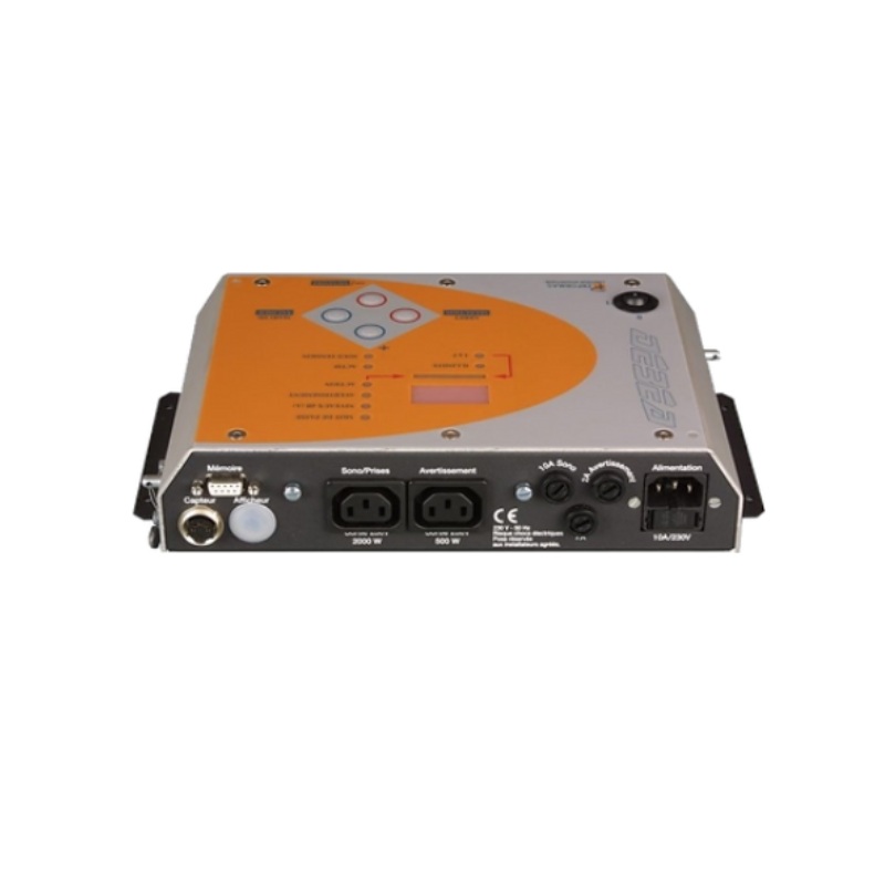 Dès que le seuil auditif est atteint, un dispositif lumineux alimenté via une sortie 230V (exemple: gyrophare, panneau afficheur digital …) incite l’utilisateur à baisser le niveau sonore).