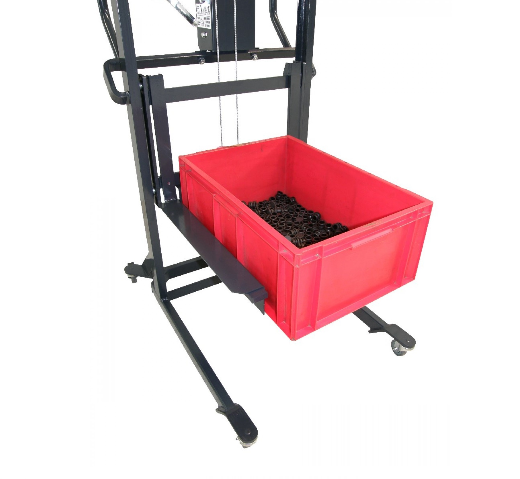 Doté de 4 roulettes directionnelles (dont 2 à frein) et de poignées ergonomiques, ce petit gerbeur est très maniable.