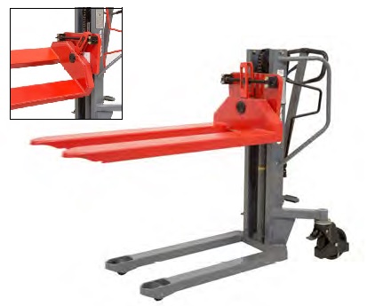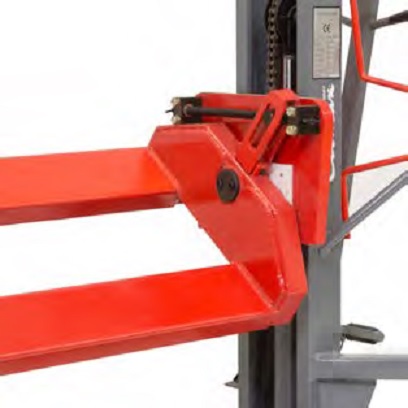 Ce mini gerbeur inclineur présente la particularité de pouvoir basculer la charge latéralement, jusqu'à 40° d'inclinaison.