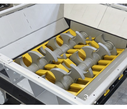 Encore une innovation : les contre-couteaux agissent sur chaque face de couteaux. L’organisation des contre couteaux est telle que les deux faces des couteaux sont utilisés pour couper la matière. Ceci permet de repartir les usures et de doubler le temps de vie des lames. En plus, ce montage supprime la charge axiale des arbres et protège le fonctionnement des réducteurs.