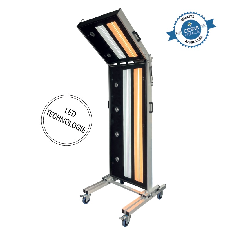 Le mur lumineux est équipé de deux lampes de contrôle de surface et six spots à hologrammes verticaux et selon un angle de 45° (articulés) sur un châssis mobile en profilé d’aluminium.