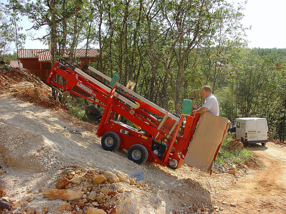 Leguan 125 est une nacelle automotrice simple et économique, légère, construite pour une utilisation professionnelle. La nacelle araignée Leguan 125 a été encore améliorée, avec notamment un frein de parc automatique et un châssis modernisé. La serie de nacelles araignée Leguan 125 est idéale pour les travaux où la machine est souvent transportée sur remorque, et où les conditions du sol sont variées et difficiles. La plateforme élévatrice Leguan 125 peut être équipée soit de 4 roues motrices soit de chenilles en caoutchouc, ce qui garantit une maniabilité excellente et une performance tout terrain exceptionnelle.