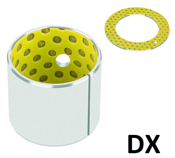Le palier lisse composite DX® est adapté aux conditions de lubrification marginale à la graisse ou à l'huile. Les bagues standard présentent des alvéoles sur la couche antifriction qui servent de réservoir de graisse ; une version avec couche antifriction lisse est disponible sur demande.