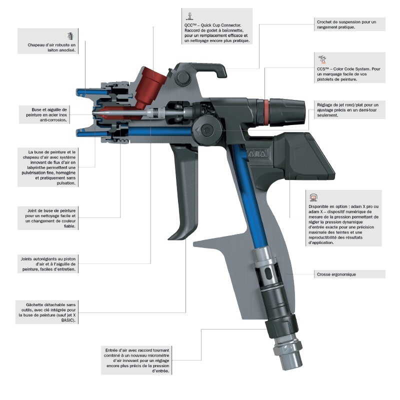 Il incorpore notamment une gâchette à clé intégrée de serrage pour la buse de peinture, détachable sans outils supplémentaires.