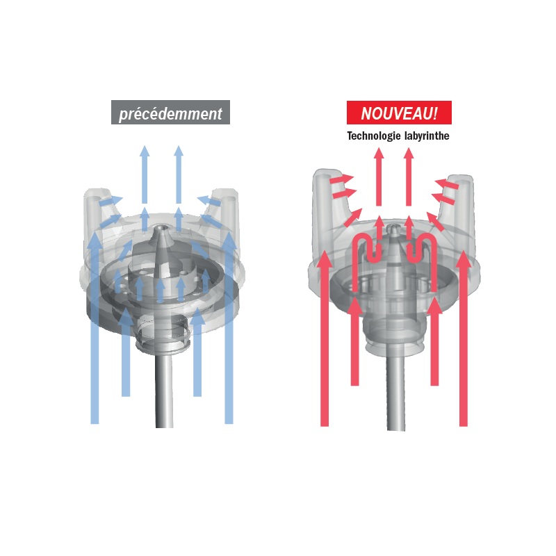 La buse de peinture combinée à un chapeau d'air à système de flux labyrinthe innovant permettent une pulvérisation fine, homogène et quasiment sans pulsation.