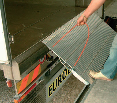 Les ponts de liaison sur rail permettent de déplacer la rampe de chargement facilement le long du quai et de l'ajuster face au camion de livraison en place. Ce type de rampe de chargement convient pour les faibles dénivellations à quai, lorsque les emplacements ne sont pas déterminés de manière fixe