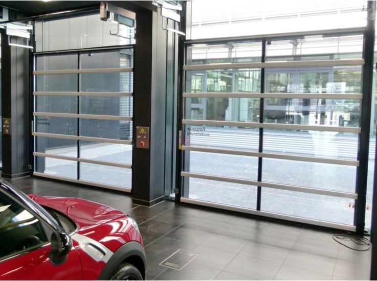 Cette porte en verre transparent est particulièrement appréciée des points de vente et concessions automobiles.