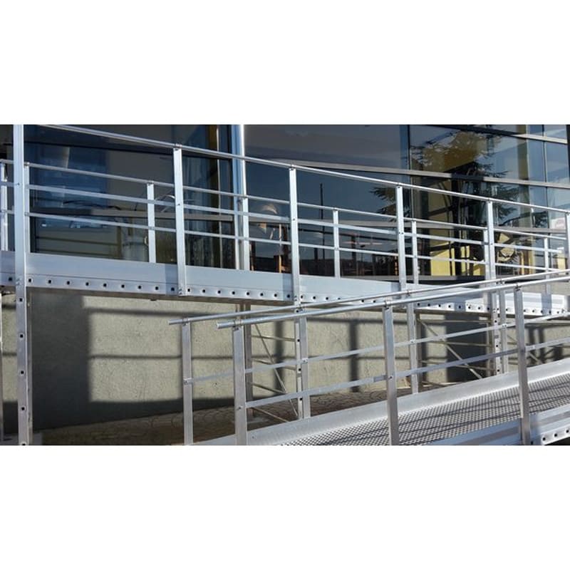 - Les rampes d’accès sont équipées de caillebotis composite antidérapant et de garde-corps latéraux de sécurité, avec lisse, sous-lisse et plinthe.
